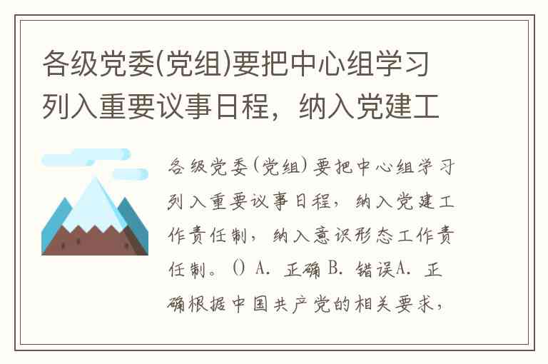各级党委(党组)要把中心组学习列入重要议事日程,纳入党建工作责任制,纳入意识形态工作责任制。() A. 正确 B. 错误