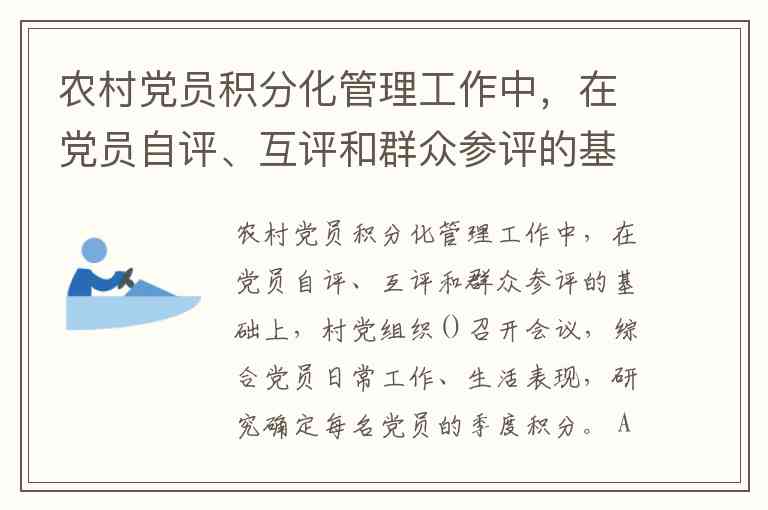 农村党员积分化管理工作中,在党员自评、互评和群众参评的基础上,村党组织()召开会议,综合党员日常工作、生活表现,研究确定每名党员的季度积分。 A. 每个月 B. 每季度 C. 每半年 D. 每一年