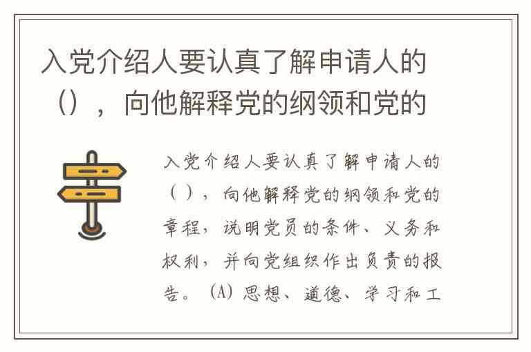 入党介绍人要认真了解申请人的(),向他解释党的纲领和党的章程,说明党员的条件、义务和权利,并向党组织作出负责的报告。 (A) 思想、道德、学习和工作表现; (B) 思想、品质、经历和工作表现; (C) 思想、品德、历史和工作表现。