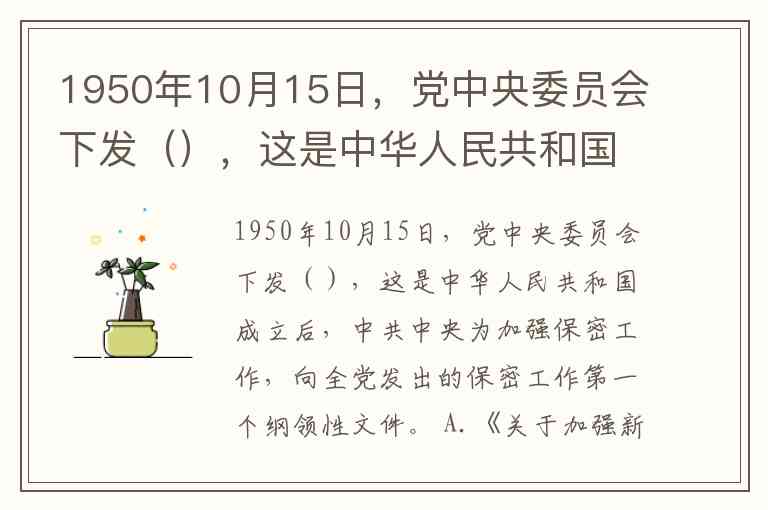 1950年10月15日,党中央委员会下发(),这是中华人民共和国成立后,中共中央为加强保密工作,向全党发出的保密工作第一个纲领性文件。 A.《关于加强新形势下国家保密管理工作的决定》 B.《关于加强和改进新形势下保密工作的决定》 C.《关于加强保守党与国家的机密的决定》 D.《关于加强保守国家秘密的决定》