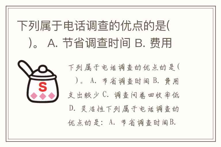 下列属于电话调查的优点的是( )。 A. 节省调查时间 B. 费用支出较少 C. 调查问卷回收率低 D. 灵活性