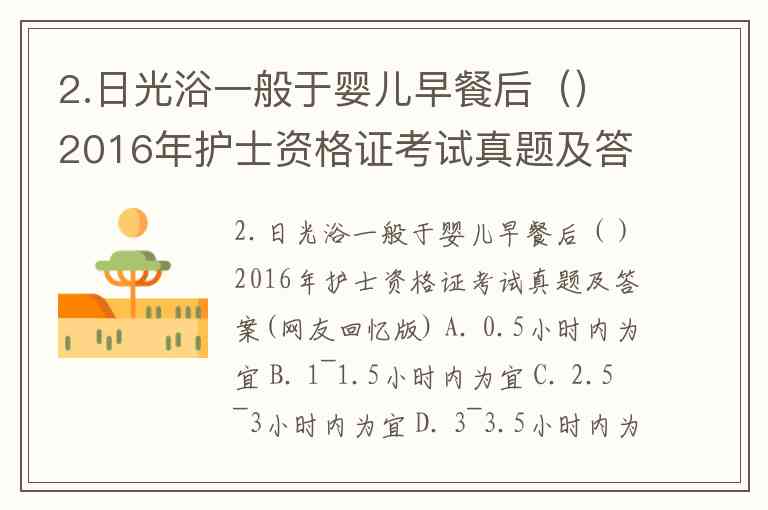 2.日光浴一般于婴儿早餐后()2016年护士资格证考试真题及答案(网友回忆版) A. 0.5小时内为宜 B. 1~1.5小时内为宜 C. 2.5~3小时内为宜 D. 3~3.5小时内为宜