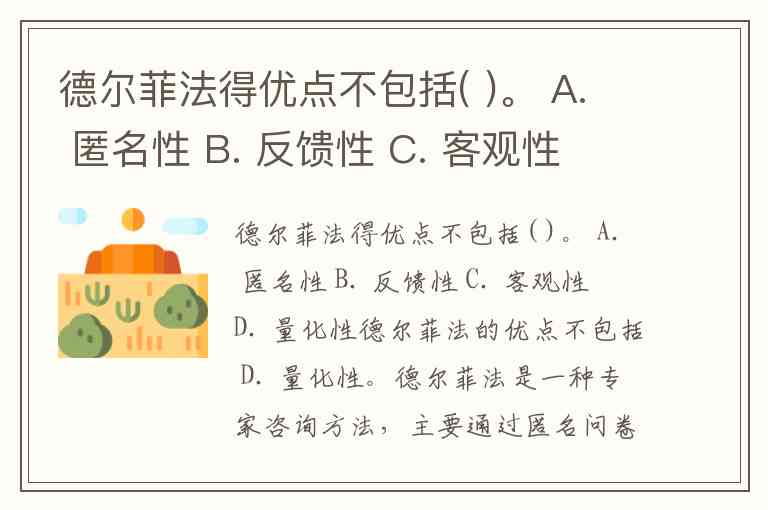 德尔菲法得优点不包括( )。 A. 匿名性 B. 反馈性 C. 客观性 D. 量化性