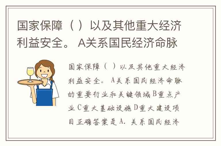 国家保障( )以及其他重大经济利益安全。 A关系国民经济命脉的重要行业和关键领域 B重点产业 C重大基础设施 D重大建设项目