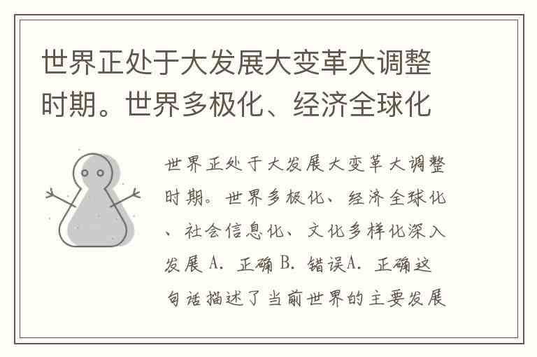 世界正处于大发展大变革大调整时期。世界多极化、经济全球化、社会信息化、文化多样化深入发展 A. 正确 B. 错误