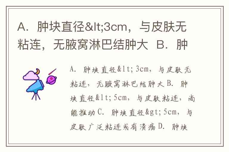 这些描述看起来是乳腺癌分期和临床评估的一部分,特别是针对肿块的大小、是否与皮肤或周围组织粘连以及淋巴结的状态。这些因素常用于帮助判断肿瘤的局部侵犯情况和判断癌症的临床分期。以下是每个描述的解读: