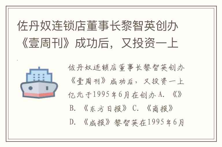 佐丹奴连锁店董事长黎智英创办《壹周刊》成功后,又投资一上亿元于1995年6月在创办 A. 《》 B. 《东方日报》 C. 《商报》 D. 《成报》