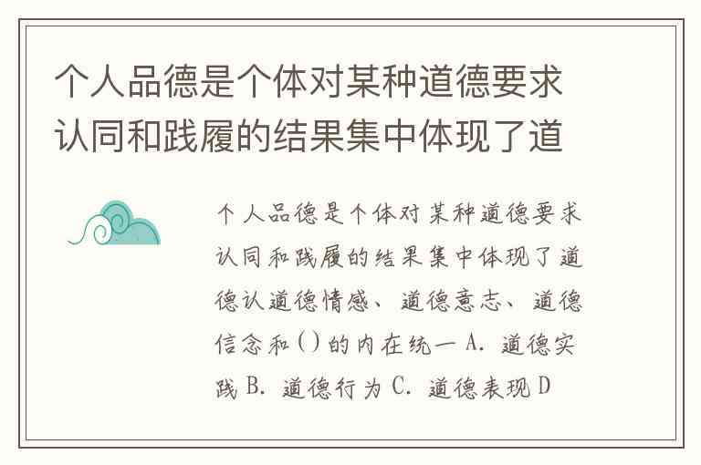 个人品德是个体对某种道德要求认同和践履的结果集中体现了道德认道德情感、道德意志、道德信念和( )的内在统一 A. 道德实践 B. 道德行为 C. 道德表现 D. 道德内容