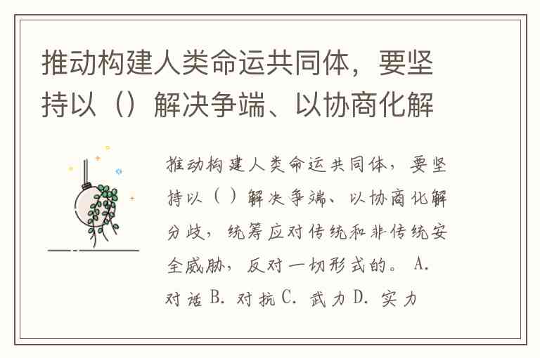 推动构建人类命运共同体,要坚持以()解决争端、以协商化解分歧,统筹应对传统和非传统安全威胁,反对一切形式的。 A. 对话 B. 对抗 C. 武力 D. 实力