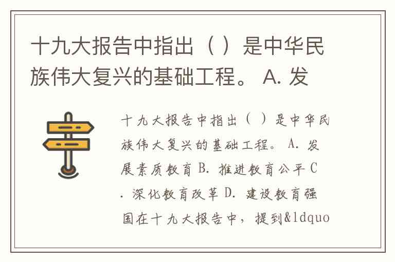 十九大报告中指出( )是中华民族伟大复兴的基础工程。 A. 发展素质教育 B. 推进教育公平 C. 深化教育改革 D. 建设教育强国