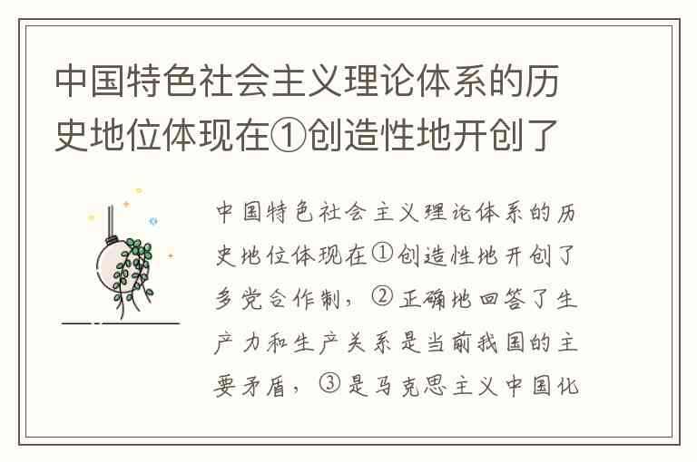 ③是马克思主义中国化第二次历史性飞跃的理论成果:中国特色社会主义理论体系是马克思主义中国化的最新成果,它继承并发展了马克思主义,进行了一次历史性的飞跃。