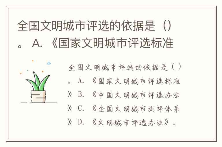 全国文明城市评选的依据是()。 A. 《国家文明城市评选标准》 B. 《中国文明城市评选办法》 C. 《全国文明城市测评体系》 D. 《文明城市评选办法》。