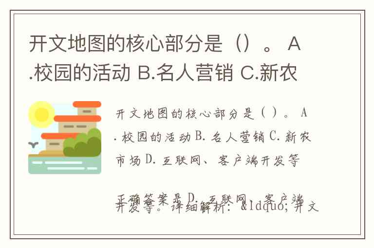 开文地图的核心部分是()。 A.校园的活动 B.名人营销 C.新农市场 D.互联网、客户端开发等