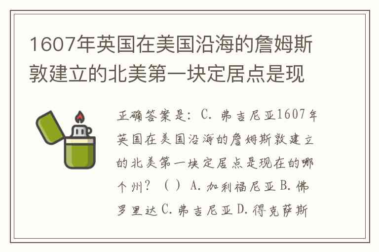 1607年英国在美国沿海的詹姆斯敦建立的北美第一块定居点是现在的哪个州?() A.加利福尼亚 B.佛罗里达 C.弗吉尼亚 D.得克萨斯