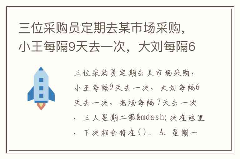 三位采购员定期去某市场采购,小王每隔9天去一次,大刘每隔6天去一次,老杨每隔 7天去一次,三人星期二第—次在这里,下次相会将在( )。 A. 星期一 B. 星期五 C. 星期二 D. 星期四