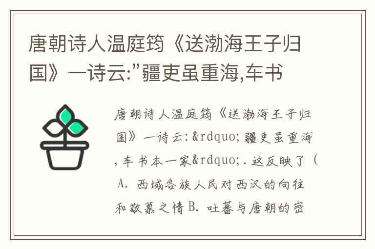 唐朝诗人温庭筠《送渤海王子归国》一诗云:”疆吏虽重海,车书本一家”.这反映了( A. 西域各族人民对西汉的向往和敬慕之情 B. 吐蕃与唐朝的密切关系 C. 北宋人民与契丹人民的友好往 D. 粟末靺鞨与唐朝的密切关系