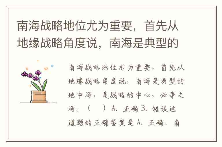 南海战略地位尤为重要,首先从地缘战略角度说,南海是典型的地中海,是战略的中心,必争之海。( ) A. 正确 B. 错误
