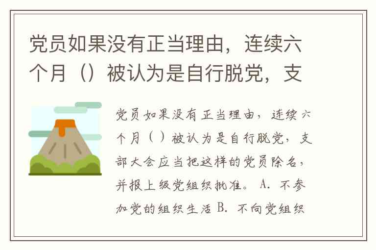 党员如果没有正当理由,连续六个月()被认为是自行脱党,支部大会应当把这样的党员除名,并报上级党组织批准。 A. 不参加党的组织生活 B. 不向党组织汇报思想 C. 不交纳党费 D. 不做党所分配的工作