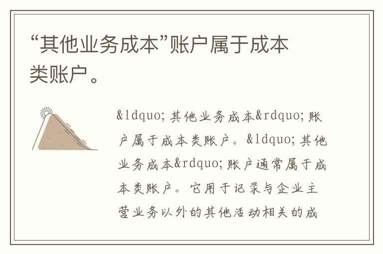 “其他业务成本”账户通常属于成本类账户。它用于记录与企业主营业务以外的其他活动相关的成本。例如,可能包括一些非主营业务的生产、运营或管理成本。这个账户的设置和使用,通常是为了确保在财务核算中能够精确地反映出与主营业务以外的各项活动所发生的相关成本。