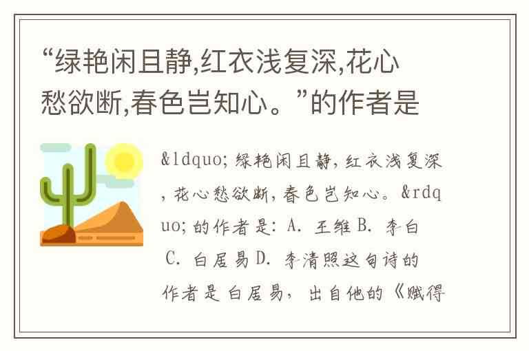 “绿艳闲且静,红衣浅复深,花心愁欲断,春色岂知心。”的作者是: A. 王维 B. 李白 C. 白居易 D. 李清照
