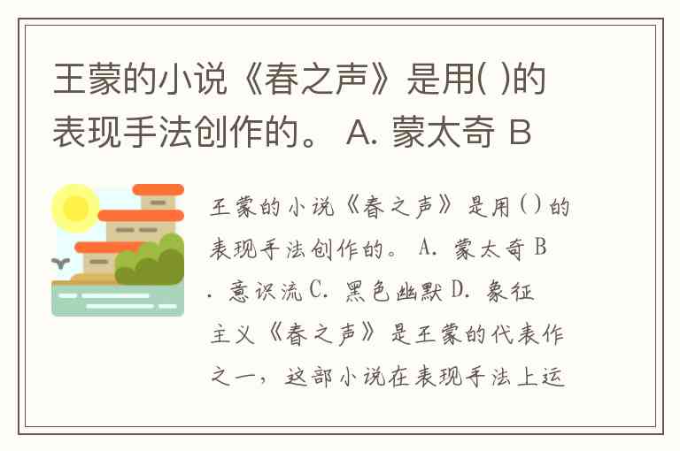 王蒙的小说《春之声》是用( )的表现手法创作的。 A. 蒙太奇 B. 意识流 C. 黑色幽默 D. 象征主义