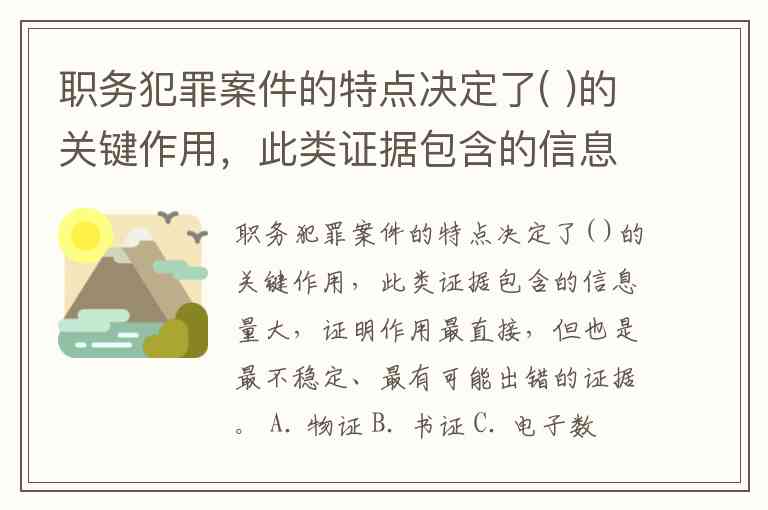 职务犯罪案件的特点决定了( )的关键作用,此类证据包含的信息量大,证明作用最直接,但也是最不稳定、最有可能出错的证据。 A. 物证 B. 书证 C. 电子数据 D. 口供