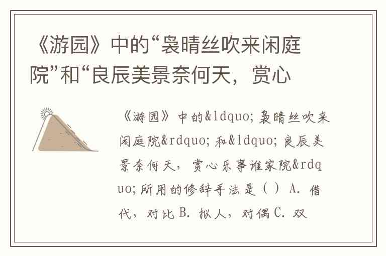 《游园》中的“袅晴丝吹来闲庭院”和“良辰美景奈何天,赏心乐事谁家院”所用的修辞手法是() A. 借代,对比 B. 拟人,对偶 C. 双关,用典 D. 比喻,通感