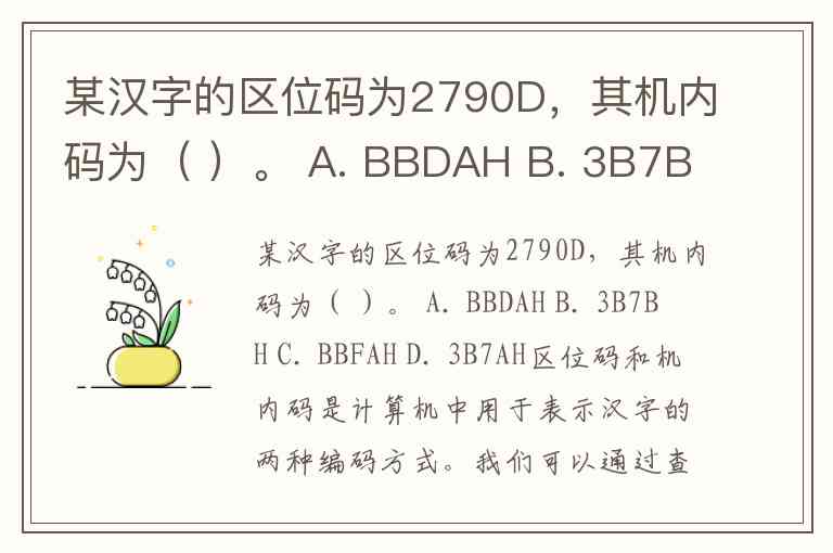 某汉字的区位码为2790D,其机内码为( )。 A. BBDAH B. 3B7BH C. BBFAH D. 3B7AH