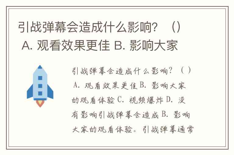 引战弹幕会造成什么影响?() A. 观看效果更佳 B. 影响大家的观看体验 C. 视频爆炸 D. 没有影响