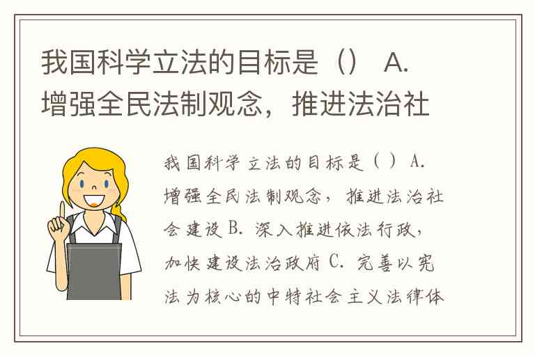 我国科学立法的目标是() A. 增强全民法制观念,推进法治社会建设 B. 深入推进依法行政,加快建设法治政府 C. 完善以宪法为核心的中特社会主义法律体系 D. 加强宪法实施