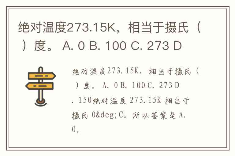绝对温度273.15K,相当于摄氏( )度。 A. 0 B. 100 C. 273 D. 150
