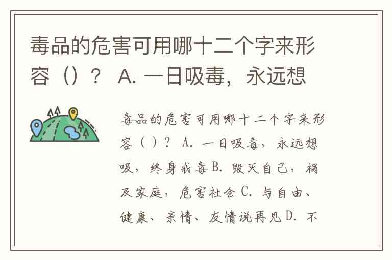 毒品的危害可用哪十二个字来形容()? A. 一日吸毒,永远想吸,终身戒毒 B. 毁灭自己,祸及家庭,危害社会 C. 与自由、健康、亲情、友情说再见 D. 不顾亲人苦求,荡然无存自尊