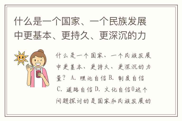 什么是一个国家、一个民族发展中更基本、更持久、更深沉的力量? A. 理论自信 B. 制度自信 C. 道路自信 D. 文化自信0