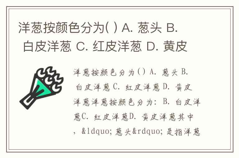 洋葱按颜色分为( ) A. 葱头 B. 白皮洋葱 C. 红皮洋葱 D. 黄皮洋葱