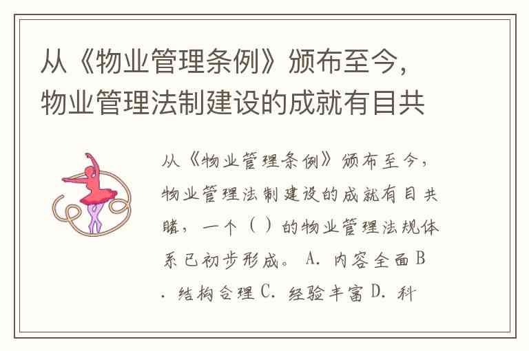 从《物业管理条例》颁布至今,物业管理法制建设的成就有目共睹,一个()的物业管理法规体系已初步形成。 A. 内容全面 B. 结构合理 C. 经验丰富 D. 科学规范 E. 特色鲜明