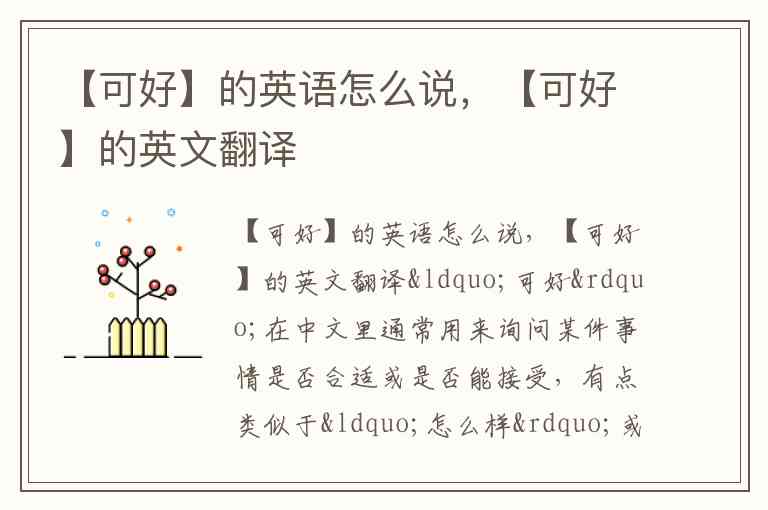 “可好”在中文里通常用来询问某件事情是否合适或是否能接受,有点类似于“怎么样”或“可以吗”的意思。根据不同的语境,英文翻译可以有所不同,常见的有: