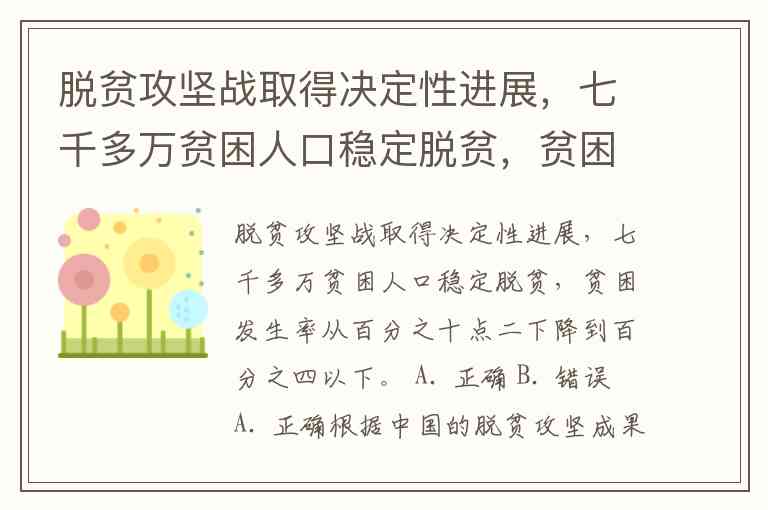 脱贫攻坚战取得决定性进展,七千多万贫困人口稳定脱贫,贫困发生率从百分之十点二下降到百分之四以下。 A. 正确 B. 错误