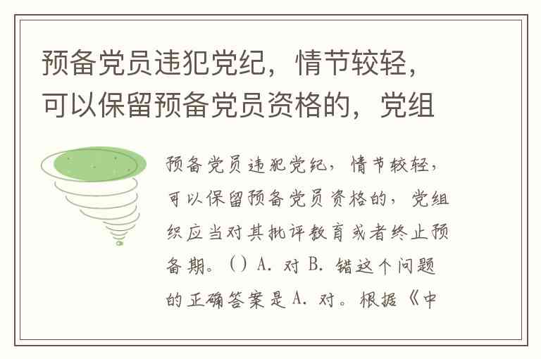预备党员违犯党纪,情节较轻,可以保留预备党员资格的,党组织应当对其批评教育或者终止预备期。( ) A. 对 B. 错