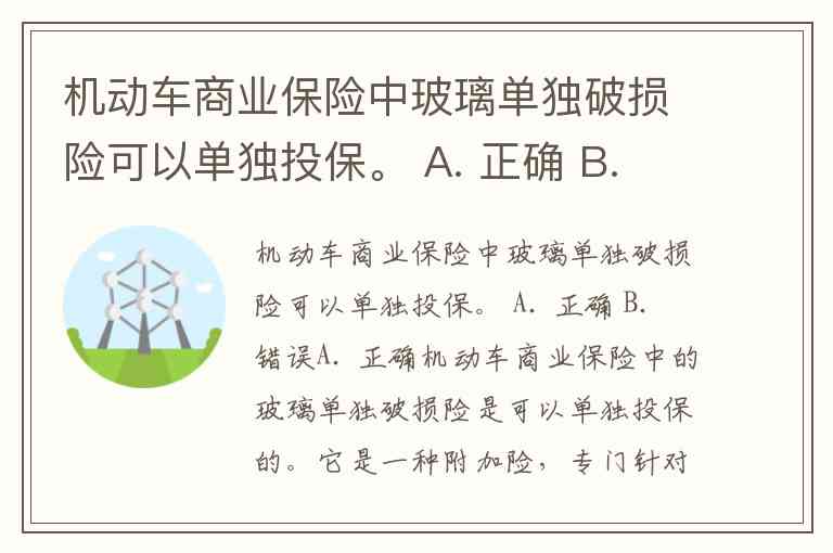 机动车商业保险中玻璃单独破损险可以单独投保。 A. 正确 B. 错误