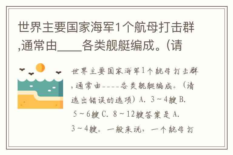 世界主要国家海军1个航母打击群,通常由____各类舰艇编成。(请选出错误的选项) A. 3~4艘 B. 5~6艘 C. 8~12艘