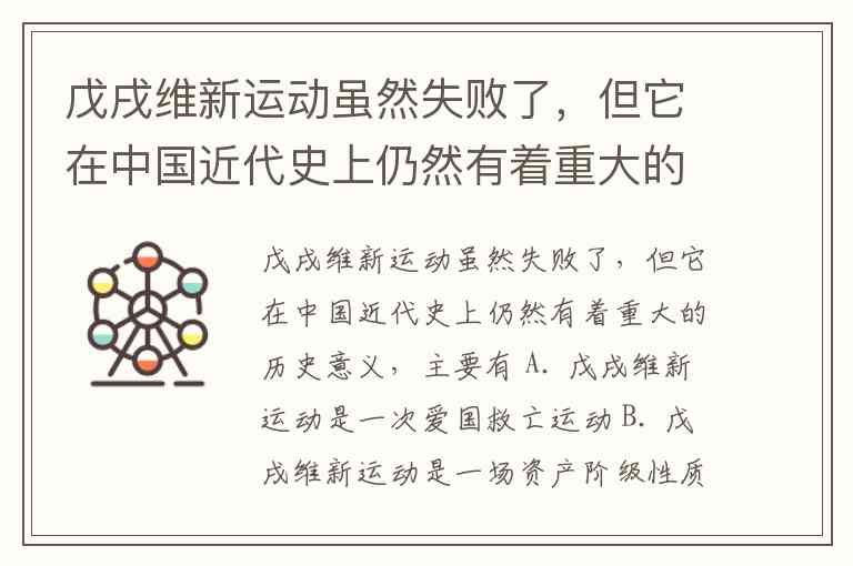 戊戌维新运动虽然失败了,但它在中国近代史上仍然有着重大的历史意义,主要有 A. 戊戌维新运动是一次爱国救亡运动 B. 戊戌维新运动是一场资产阶级性质的政治改革运动 C. 戊戌维新运动是一场思想启蒙运动 D. 戊戌维新运动是一场地主阶级自救运动