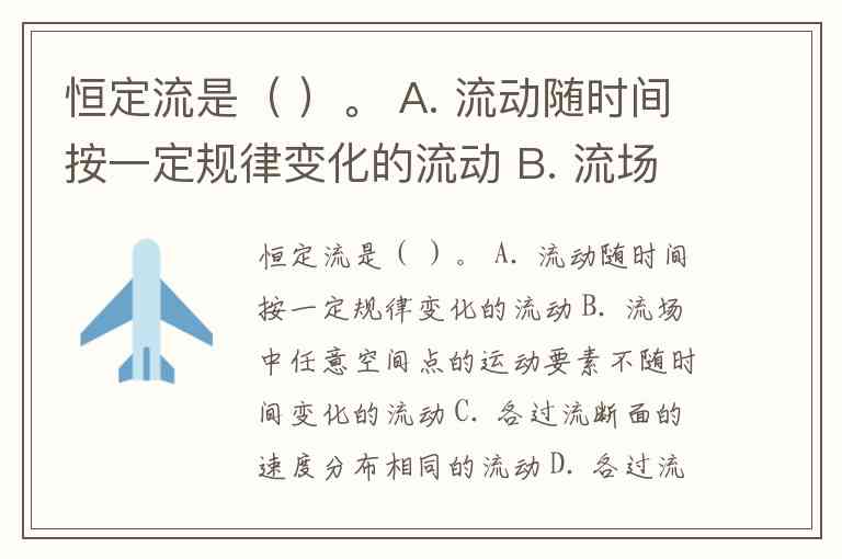 恒定流是( )。 A. 流动随时间按一定规律变化的流动 B. 流场中任意空间点的运动要素不随时间变化的流动 C. 各过流断面的速度分布相同的流动 D. 各过流断面的压强相同的流动