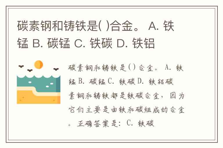 碳素钢和铸铁是( )合金。 A. 铁锰 B. 碳锰 C. 铁碳 D. 铁铝