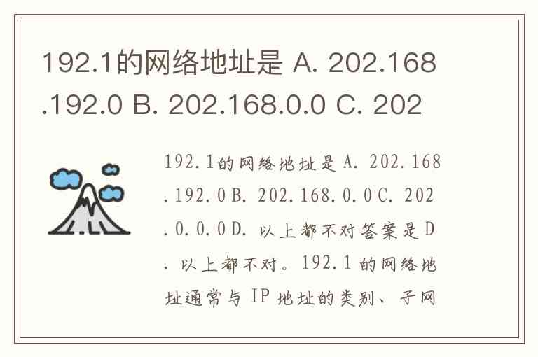 192.1 的网络地址通常与 IP 地址的类别、子网掩码有关。如果没有给出具体的子网掩码信息或网络细节,仅凭 "192.1" 这个部分无法明确确定它属于哪个网络。