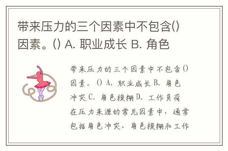 带来压力的三个因素中不包含()因素。() A. 职业成长 B. 角色冲突 C. 角色模糊 D. 工作负荷