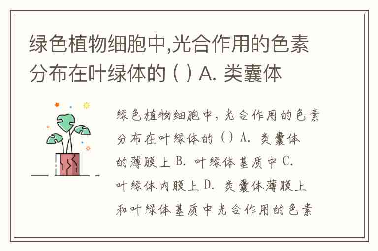 绿色植物细胞中,光合作用的色素分布在叶绿体的 ( ) A. 类囊体的薄膜上 B. 叶绿体基质中 C. 叶绿体内膜上 D. 类囊体薄膜上和叶绿体基质中