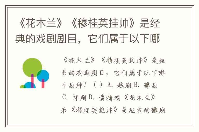 《花木兰》《穆桂英挂帅》是经典的戏剧剧目,它们属于以下哪个剧种?() A. 越剧 B. 豫剧 C. 评剧 D. 黄梅戏