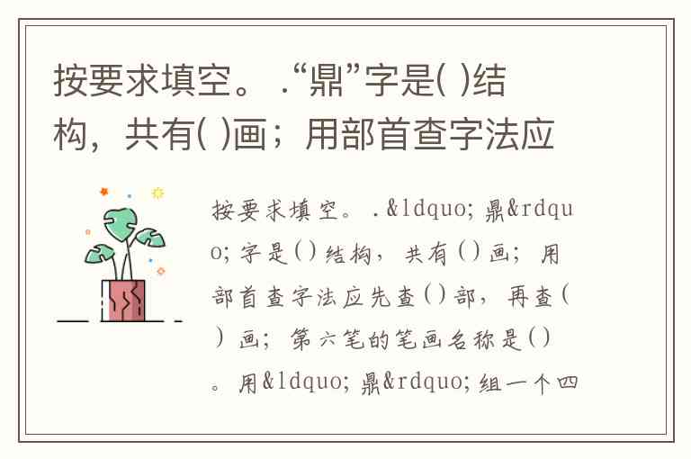 按要求填空。 .“鼎”字是( )结构,共有( )画;用部首查字法应先查( )部,再查( ) 画;第六笔的笔画名称是( )。用“鼎”组一个四字词语:( )。 2.“耀”字共有( )画;用部首查字法应先查()部,再查( )画。在字典里的解释有:①光线强烈地照射;②炫耀;③光芒;光辉;④光荣。“照耀”、“荣耀”、“光耀” 中的“耀”应分别取第 ( )、( )、( )种解释。