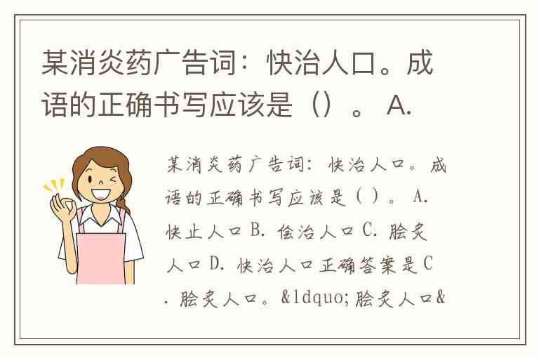某消炎药广告词:快治人口。成语的正确书写应该是()。 A. 快止人口 B. 侩治人口 C. 脍炙人口 D. 快治人口