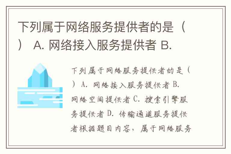 下列属于网络服务提供者的是() A. 网络接入服务提供者 B. 网络空间提供者 C. 搜索引擎服务提供者 D. 传输通道服务提供者